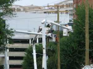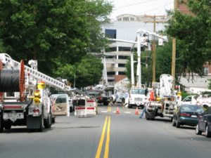 Carlin Springs Road is still closed between North Glebe Road and Vermont Street after a utility pole collapsed, sparked a fire and knocked out power to nearly 2,000 homes and businesses.