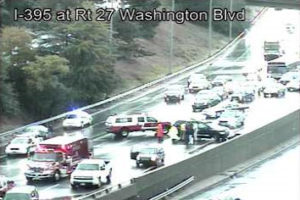 An SUV rolled over several times on southbound I-395 near the ramp to Washington Boulevard. All lanes are currently blocked.