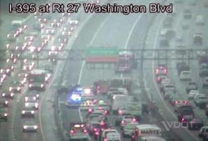 Southbound traffic on both the mainline and HOV lanes of I-395 is very heavy approaching the accident. One lane of HOV traffic is now slowly squeezing by the scene.