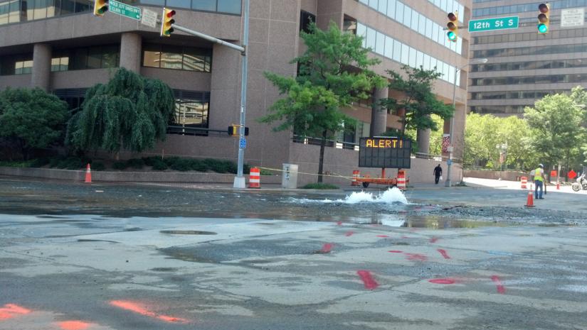 For at least an hour, water was spraying about 5 feet in the air out from buckled pavement at the intersection of 12th Street and S. Clark Street. Arlington County crews managed to shut off several valves, which reduced but did not stop the water flow for several hours. As of now, the water flow has been stopped, but not before it created a large pond in and around the intersection.
