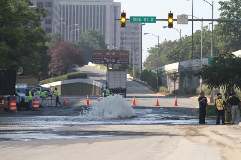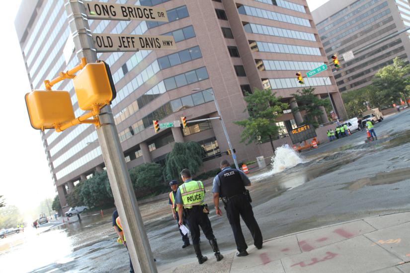 The water came from a rupture in a 12-inch water main, according to Arlington County Department of Environmental Services spokeswoman Shannon Whalen McDaniel. As a result of work to stop the water flow, several large nearby buildings — 200 and 201 12th Street S.; 1215, 1225 and 1235 S. Clark Street; and the North Tract Loft apartments — had their water supply cut.