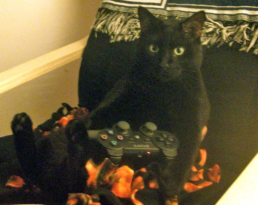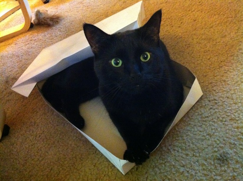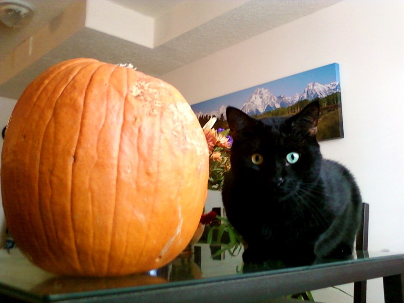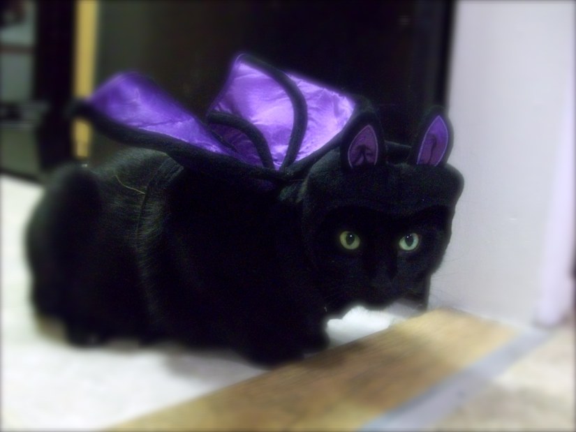 Severus is a cat of many names, but most humans just call him Sev. His full name is Severus “The Percolator” Monk Omar Scarface. A breakdown of his name includes: Severus, after, you guessed it!, the infamous Slyerian Headmaster Severus Snape (he even sports the House colors): “The Percolator” after his brewing coffee purr; Monk after the famous OCD TV detective (Severus is particularly fearful of plastic bags and freezers), and Omar/Scarface due to the scar he has on his nose from before the adoption. Extra points if you can guess which TV show the name Omar comes from! (Hint: filmed in Baltimore, MD, where Severus’ mom went to college)