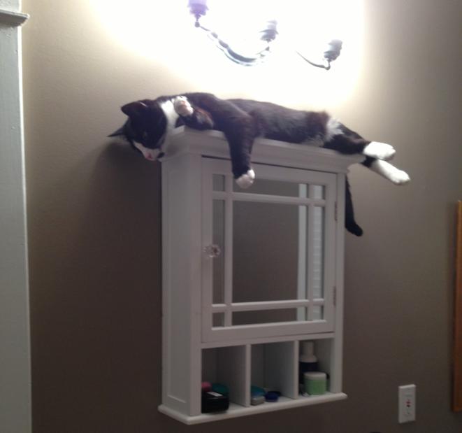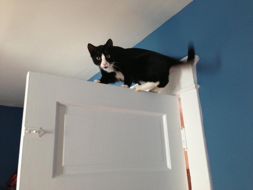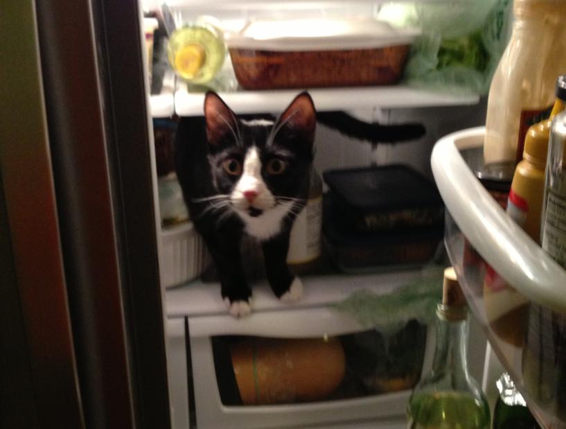 Tux is a full-time explorer/thrill seeker and curses daily his lack of an opposable thumb — his only impediment from taking over all of Arlington…and then the world. He manages to get into some pretty tricky spots including the momentarily opened refrigerator, exposed rafters, and the top shelf of closets via hung clothes. Tux is quite handsome, and unfortunately knows it. When told, “Tux, you are the Ryan Gosling of cats!” he nonchalantly states (with a perfectly-shaped pink nose in the air), “More like this Ryan Gosling is the Tux of humans.” Like any prima donna he is very much into getting his way — where he sleeps, when he eats, etc. When Tux does not get his way, he lets everyone know with a meow-ed soliloquy to announce “I am descended from lions… LIONS!”