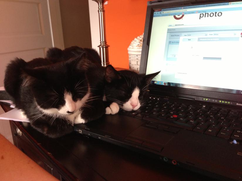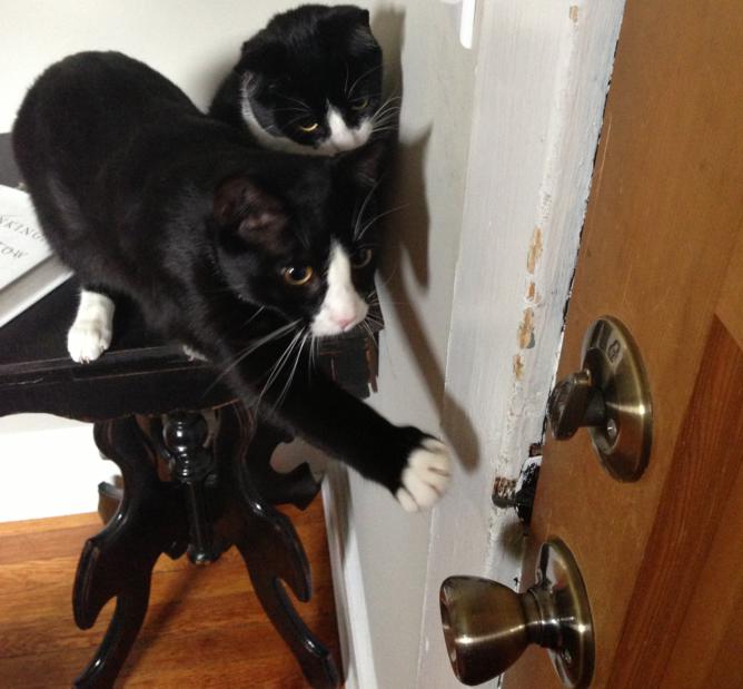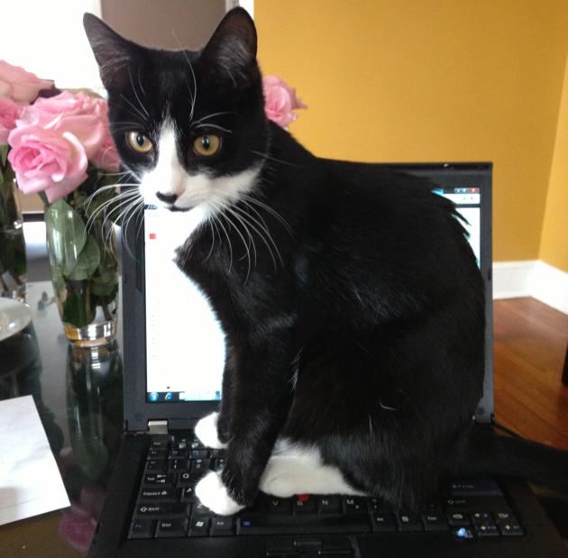Gus, while just too cute for his own good, is a consistent partner in crime, jimmying open doors and cabinets for Tux to then explore. He is also wanted in connection with of a series of hair tie robberies; some so brazen they were taken right from his mom’s hair while she slept. Gus’ creativity comes through by way of his micro blogging. He is always eager to help his mom and dad with their computer work by jumping on the keyboard, adding insightful and well-placed comments like “zzzzzzzzzzzz” and “zdfesefe.” Gus has recently petitioned for a Twitter account, telling us, “I got all this stuff inside, and I have to get out it to the people. #tweetsfromacat #pawprose #tuxedotweeter.” But ultimately, he aspires to be a scientist. So far his experiments have primarily focused on Newton’s Law of Gravity, testing that all items knocked off of tables or dressers do in fact fall to earth. In a recent report authored by Gus, he detailed a 100% passage of all his tests, confirming Newton’s Law continues to hold true today.