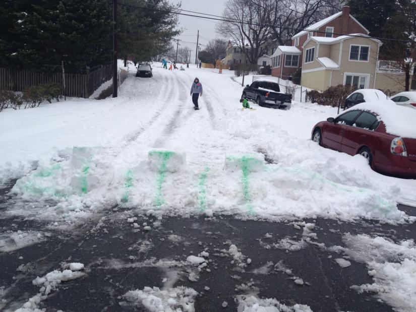 In Courthouse, a gigantic mound of plowed snow was piled up in the median, blocking a crosswalk adjacent to the Metro station. That is creating a hazard for pedestrians and drivers alike.