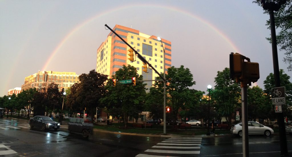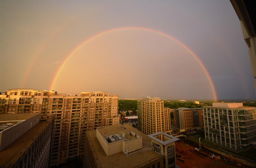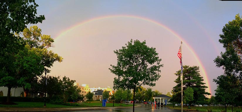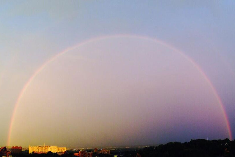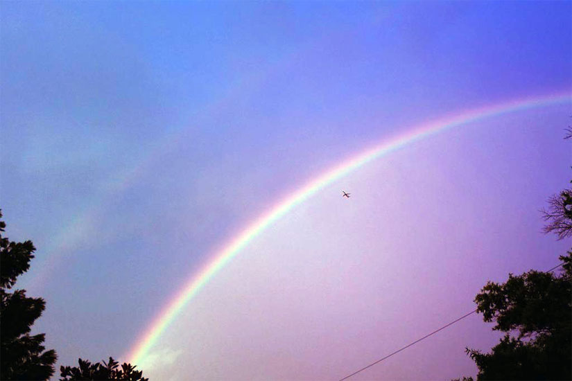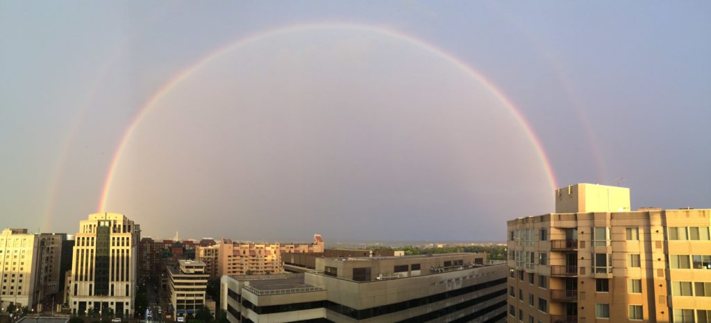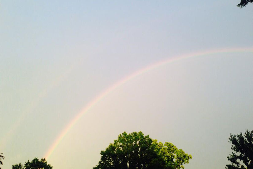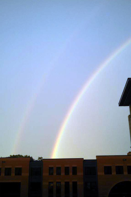 Between storms last night, there was a period of pure serenity — a crystal clear double rainbow appearing in front of a golden sunset.