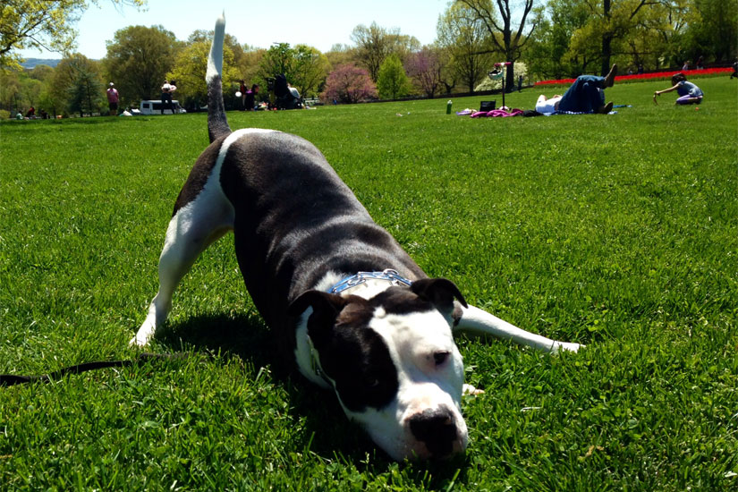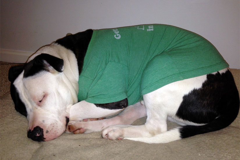 Now he is in a loving home where his owners shower him with love and attention. His favorite activities involve sleeping on the couch, sleeping in his bed and sleeping on the hallway rug. You always know where he is because he snorts like a pig non-stop, but he hardly ever barks. He loves going for walks with his owners in the evenings after work to explore the neighborhood and areas like Great Falls on the weekend where he sniffs everything.
