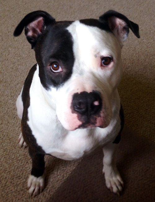 Riley is a 2 1/2 year old American bulldog/pit bull mix. His owners adopted him from a rescue organization called Mutts Matter when he was 1 1/2 years old after seeing their profile of him as the Rescue Profile of the week on The Falls Church Patch. He was raised with his bff, a Chihuahua, and they were both surrendered together. The Chihuahua was adopted quickly but Riley wasn’t, so he got really depressed, stopped eating and lost a bunch of weight. When his owners saw him, they knew he needed a good home.