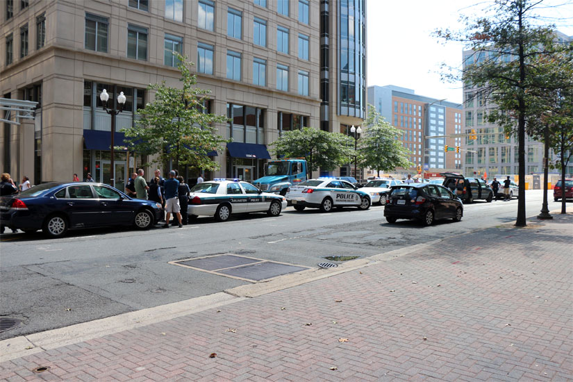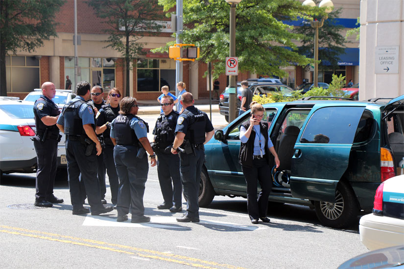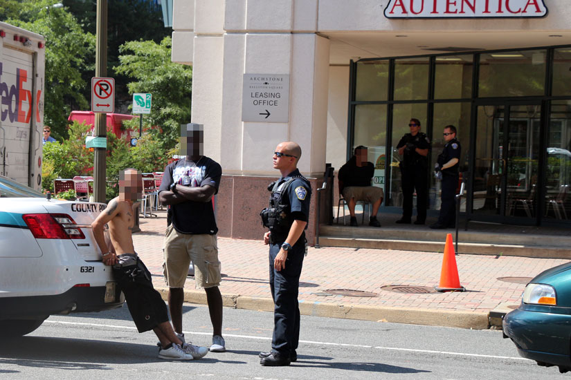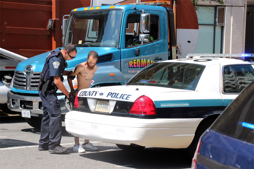 In total, nine police vehicles responded to the call, at the corner of Wilson Blvd and N. Randolph Street in front of Pizza Autentica. Murphy said the large response, which included plainclothes officers, was warranted because of the number of suspects in the minivan, which was later towed from the scene. The van had chemicals and cleaning supplies in it, leading onlookers to question whether it was, as one put it “a rolling meth lab,” but Murphy said the individuals were only suspected of bike theft.