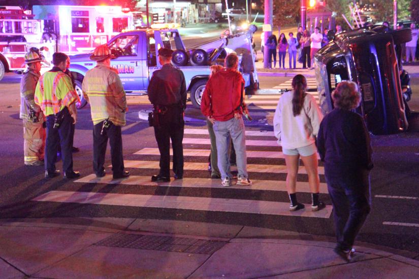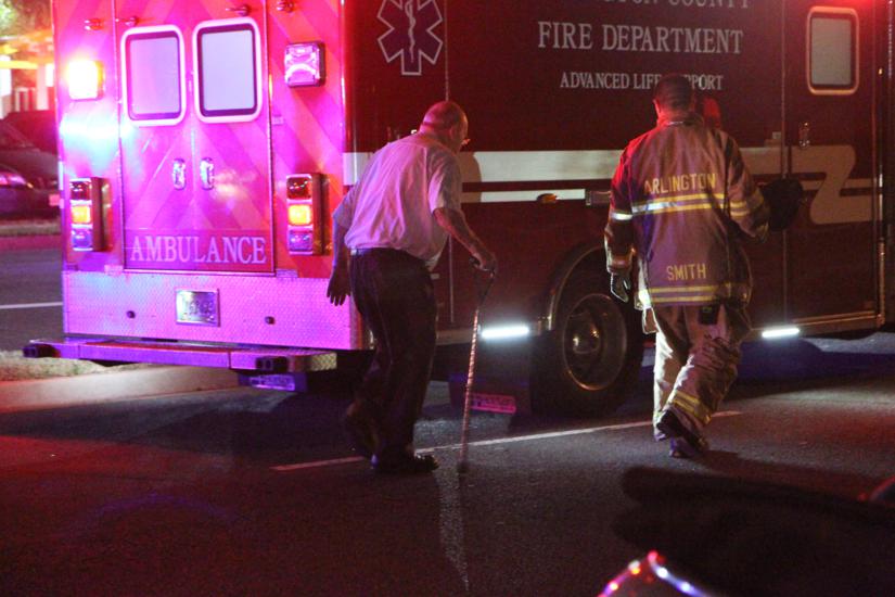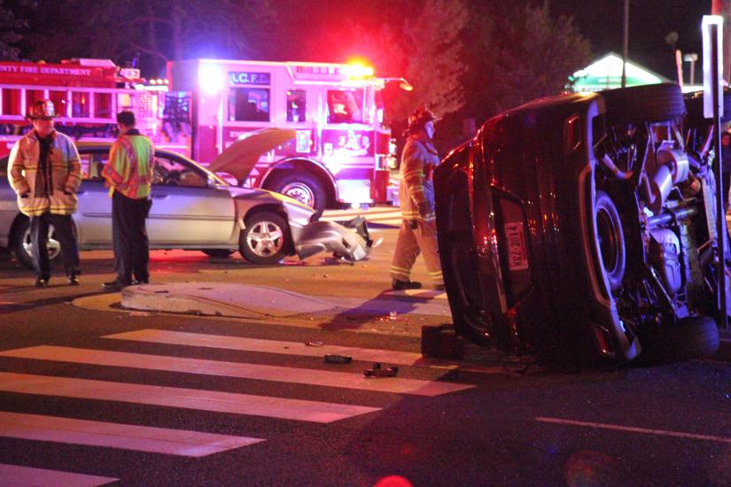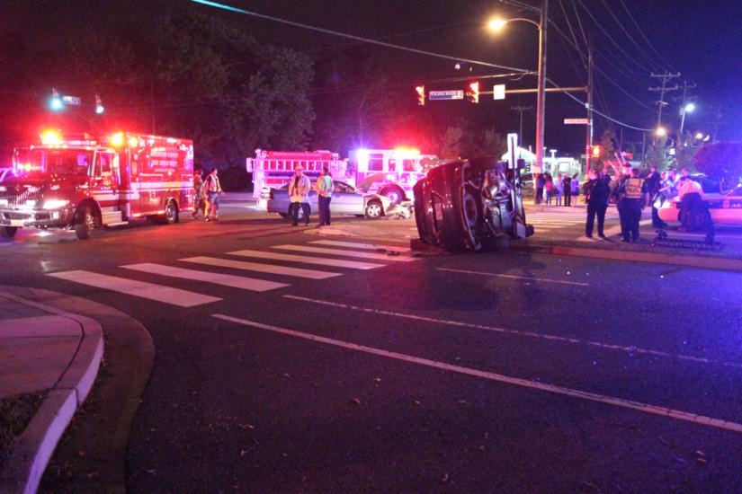 According to a witness, an elderly man in a Chevy Impala on Wilson Blvd ran a red light, broadsiding an SUV that was heading north on George Mason. The SUV flipped on its side and came to rest next to a street sign.