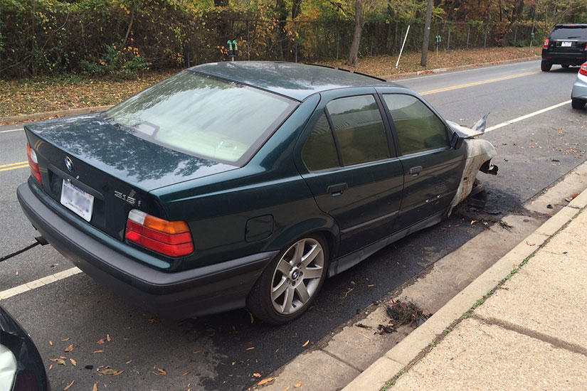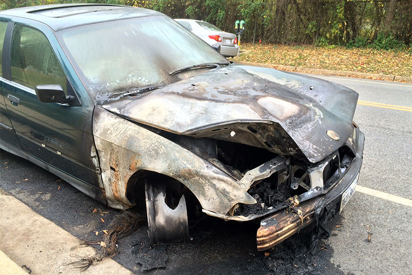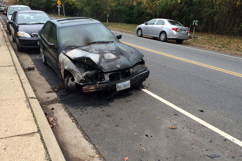 A BMW 3-series sedan, with its front end burned out, is parked along 31st Street, a road that connects Shirlington and the Fairlington neighborhood.