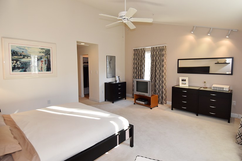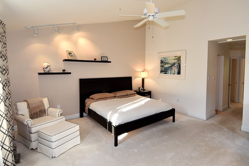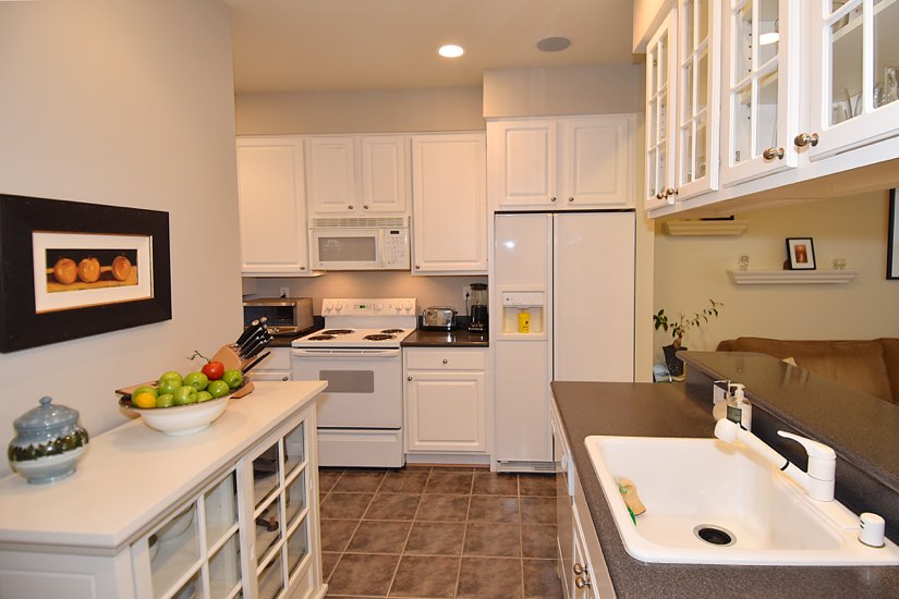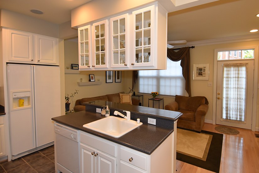 Features include crisp white cabinets and appliances, Corian countertops, and a breakfast bar at open kitchen. The top floor is given over to the master suite with two walk in closets and an appealing bathroom offering soaking tub and a large vanity.