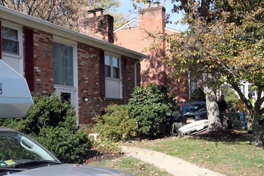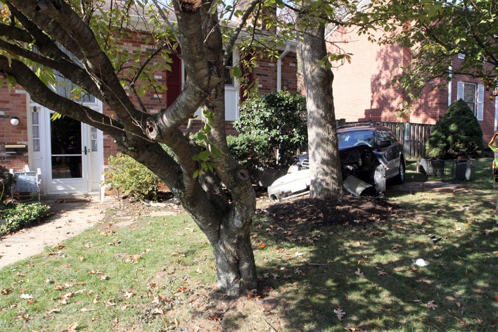 It caused damage to the front of the car, but did not appear to have caused much damage to the tree or any of the surrounding houses.