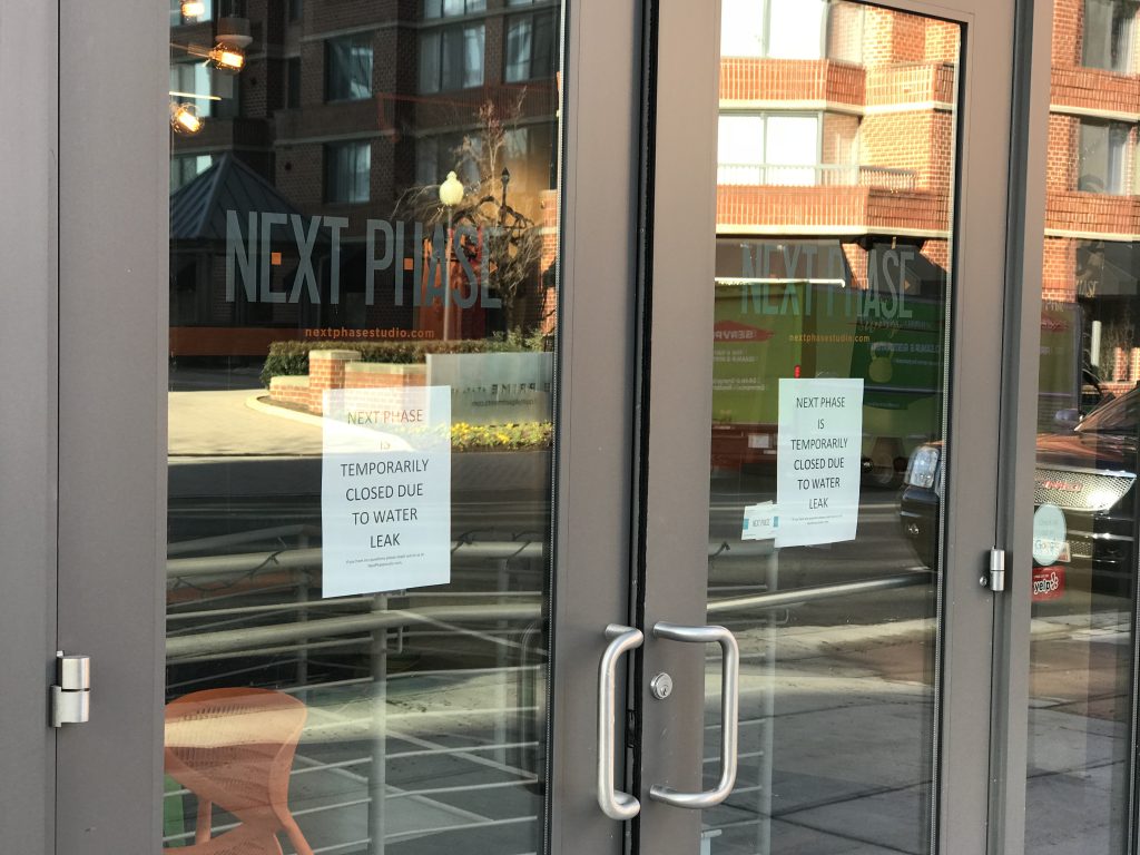 A burst water pipe in an apartment building has closed the offices of the Arlington Chamber of Commerce and the Next Phase fitness studio in Courthouse.