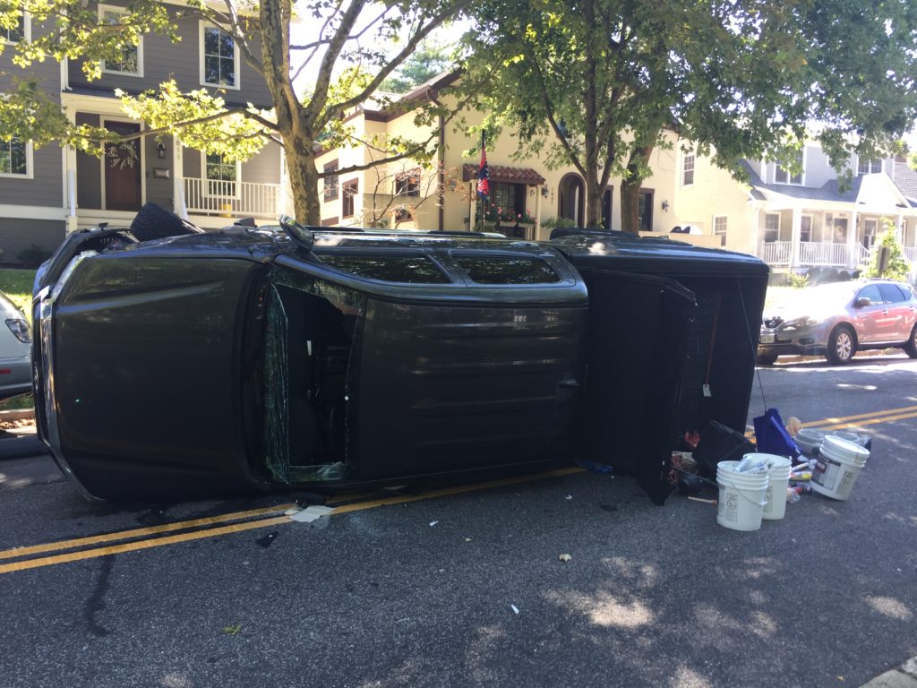 (Updated at 12:35 p.m.) A driver overturned his pick-up truck following an accident in Lyon Village this morning (Thursday).