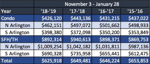 - Prices Are… Down?: In order to draw a high level of confidence in a data set, data scientists generally recommend collecting at least 30 samples.With 350 sales (samples) of Arlington homes having gone under contract since November 3, you’d think that I’d be confident in the conclusion highlighted in the data set below which shows a decrease in the average sold price of Arlington homes that went under contract from November 3 to January 28.