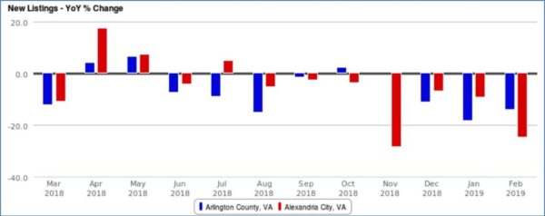The easiest way to answer the question is to look at the Year-over-Year change in the number of new listings to hit the market each month. Over the last three months, the YoY difference in new listings in Arlington has been -11%, -18.4% and -13.9%. The City of Alexandria has followed a similar pattern.