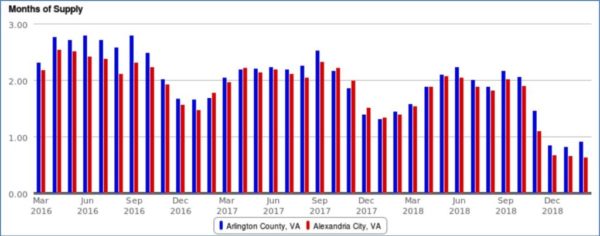 Arlington and the City of Alexandria have hovered around 2-3 months of supply for most of the past 6-7 years, having never dropped below the one-month mark for 10+ years… until December 2018, when the two combined to average about .75 months of supply each of the last three months.