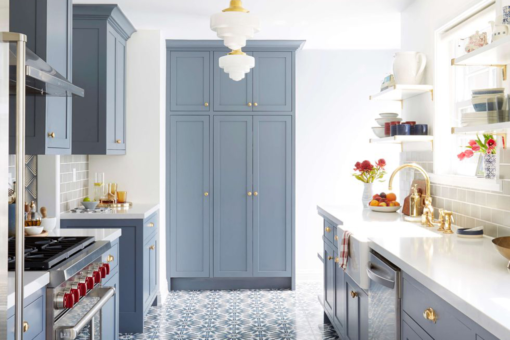 - Blue Kitchens — Blue toned cabinets paired with brass or gunmetal hardware creates a warmer and more welcoming space.