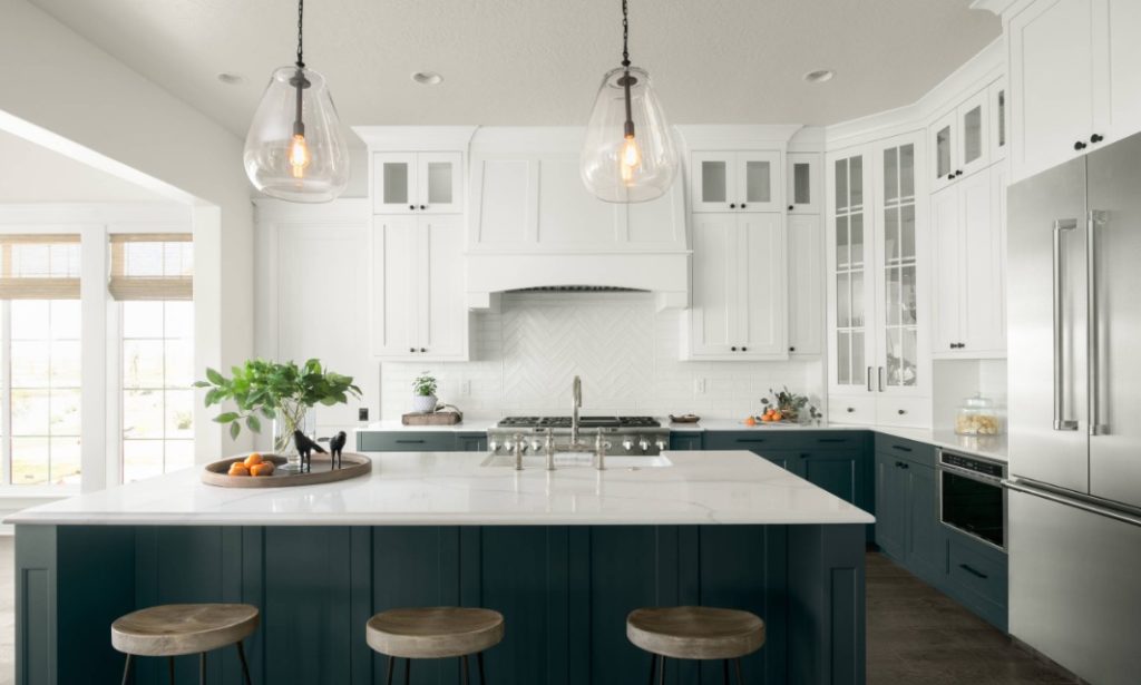 - Two-tone Cabinets — Green/grey/blue bottom cabinets paired with white upper cabinets. Creating the warm and inviting feel of the blue-tone cabinets without going “all-in.” Should be paired with understated and simple hardware.