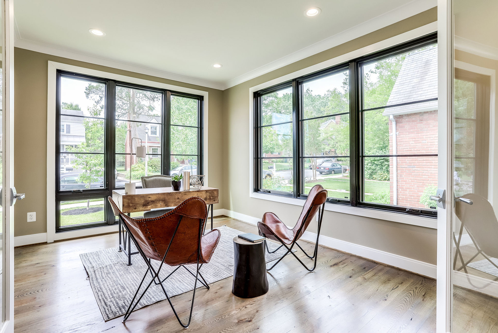 Beautiful live sawn hardwood floors warmly welcome you inside as soon as you walk through the front door. Large black-cladded windows fill each room of this home and you notice this as soon as you turn from the foyer into the bright home office full of natural light! Working from home appears to be a new normal these days. Having a space where you can work in peace is important!