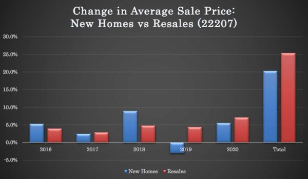 The charts below compare the annual change in the average price of a new SFD home and a resale SFD home. The first chart shows all Arlington SFD sales and the second chart is just for the 22207 zip code which accounts for 54% of all new SFD home sales since 2015.