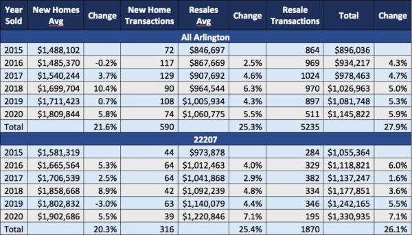 Answer: So far this year, the average sold price of a single-family detached (SFD) home in Arlington is $1,146,000, but if you remove the sales of new homes, which are averaging $1,810,000 in 2020, the average price for a SFD home in Arlington drops 7.4% to $1,060,000. Since 2015, the average price of a new SFD home in Arlington has increased by 21.6%, while the average price of resale homes has increase 25.3%.