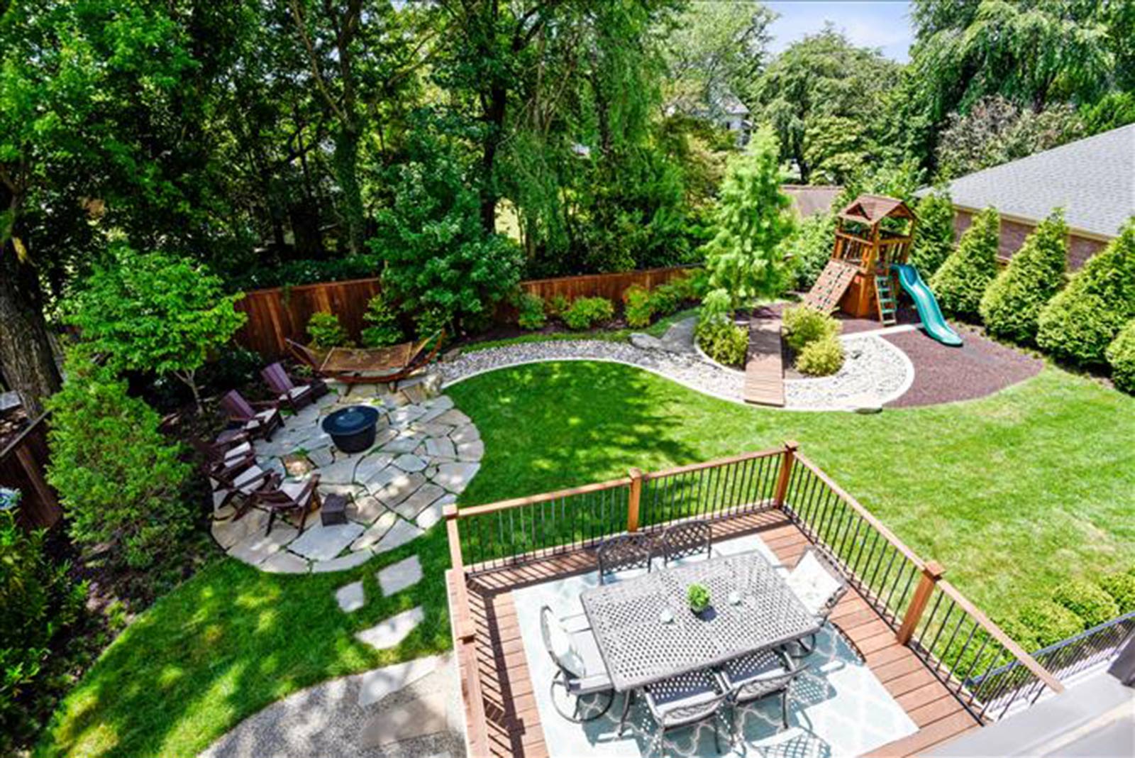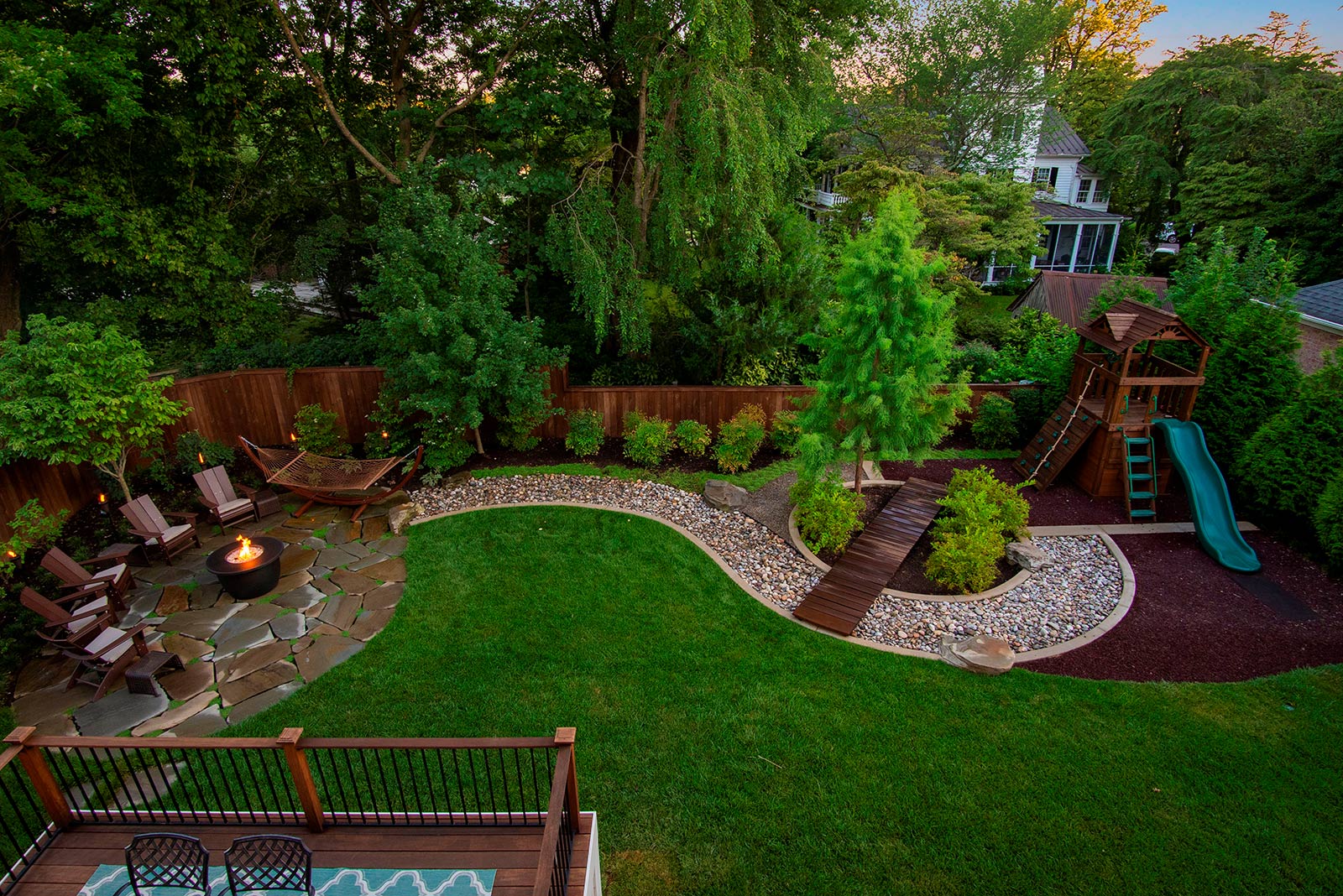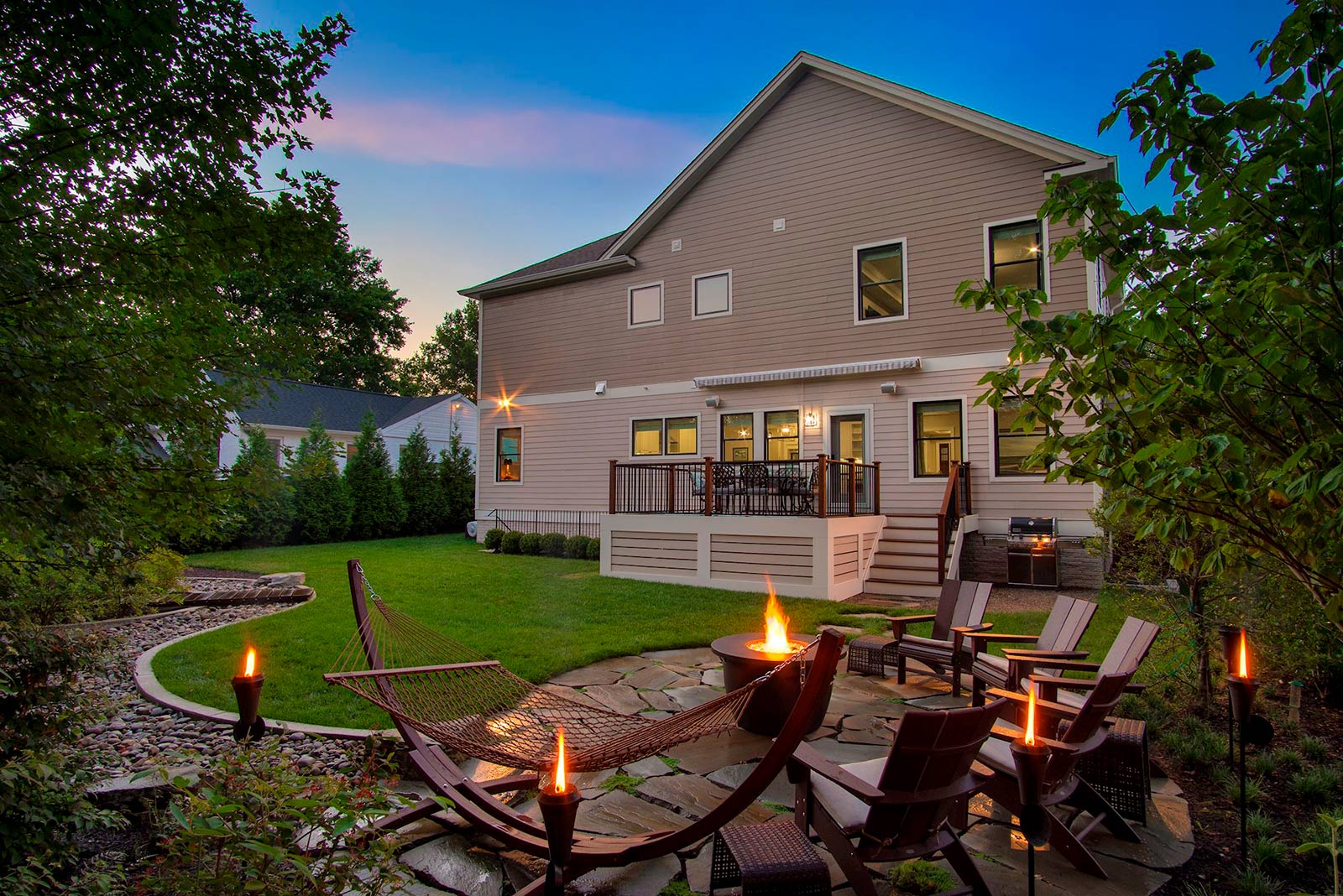 Craving more outdoor space these days? You will love relaxing on the gorgeous Cumaru Brazilian Teak deck with retractable awning, gathering around the Cooke custom 60″ fire pit, or chasing fireflies while enjoying the professionally designed green space.