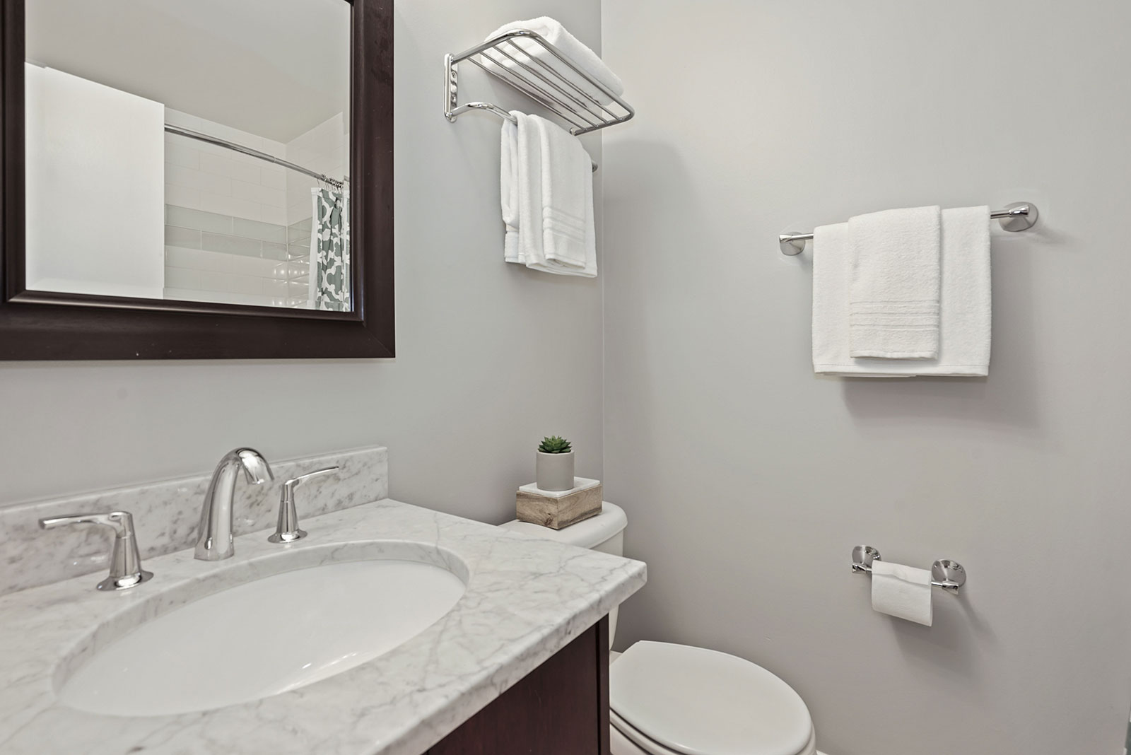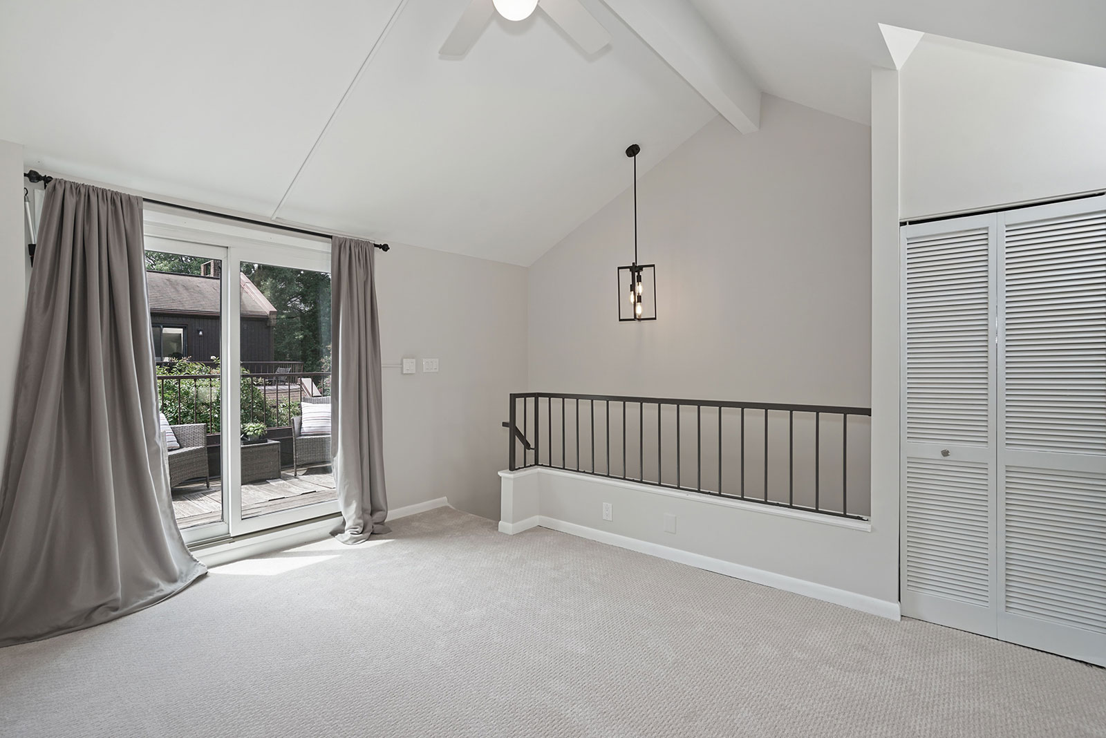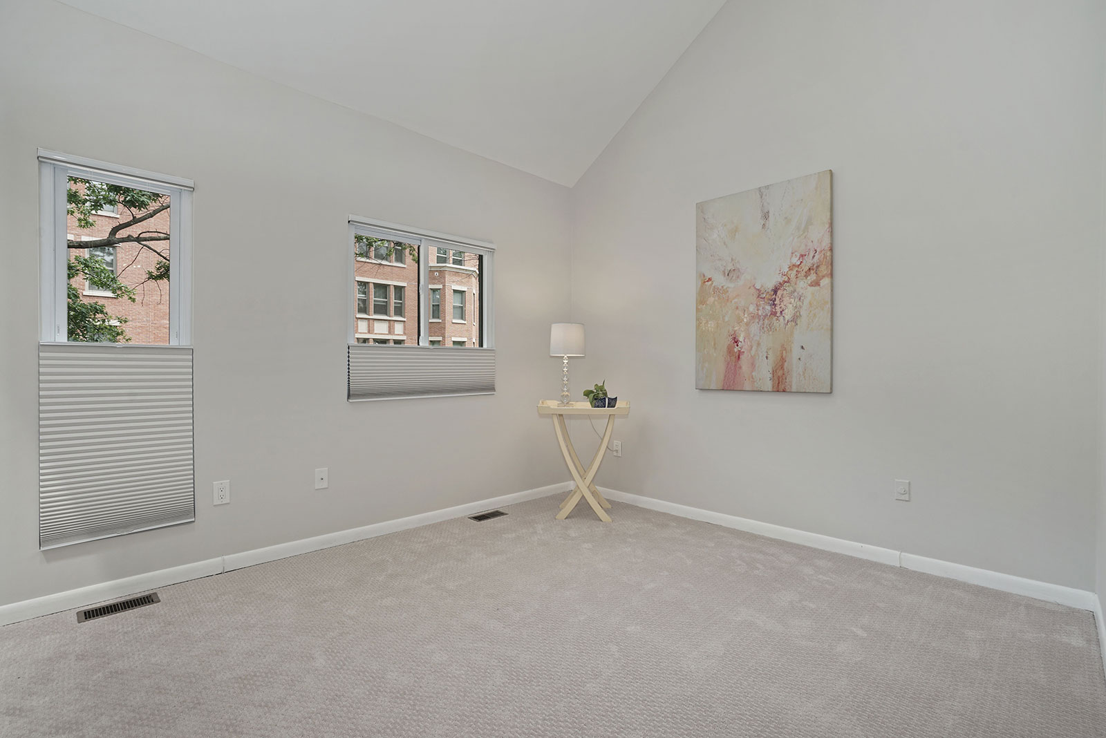 The primary bedroom has double closets and a vaulted ceilings with a loft above it. The loft has both skylights and sliding doors to a balcony with treed views of the courtyard and Ballston’s northwestern skyline. It could be enclosed for a third bedroom or an office, workout space or Zoom room. The second bedroom has a wall of closets and pretty views of greenery. The second bathroom, linen closet, washer and dryer complete this level.