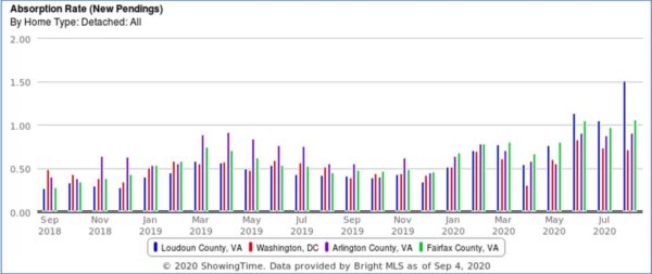 The first chart shows a dramatic increase in the absorption rate in Fairfax and Loudoun Counties since June, far outpacing the D.C. and Arlington markets. Loudoun County, the furthest/least densely populated of the four markets was on fire in August, with an already high absorption rate increasing nearly 50% over July.