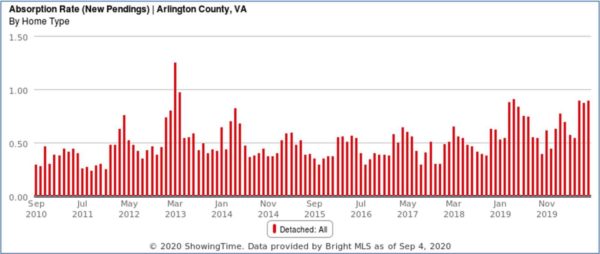 The absorption rate, a strong metric for demand, has almost always been higher in D.C. and Arlington than in Fairfax and Loudoun Counties. An absorption rate of 1.0 equals one home under contract for every home listed for sale and greater than 1.0 means homes are going off the market faster than they’re being put in the market.