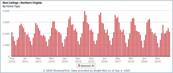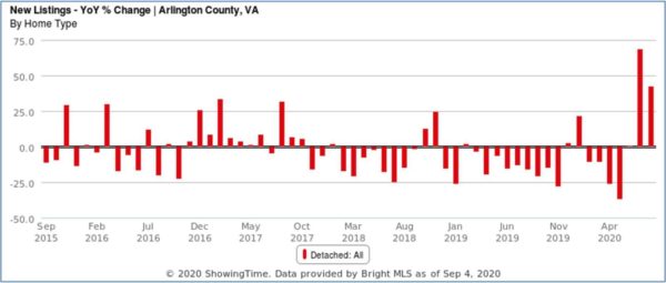 The year-over-year change in SFD listing volume in Arlington for July and August is pretty extreme (see second chart below) simply because of how low volume was in 2019 due to the Amazon HQ2 announcement, but the numbers still fall well below a normal spring market.