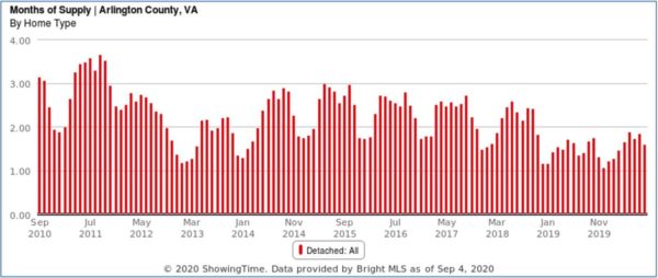 Months of Supply for SFD homes in Fairfax and Loudoun Counties has blown through 10+ year historical lows (first and second charts) and shows no sign of slowing down (prices likely rising rapidly), while Months of Supply has tapered off and even increased slightly in Arlington (third chart), a sign that prices might be stabilizing. Months of Supply in Arlington is still way too low to create a buyer’s market where prices might start dropping.