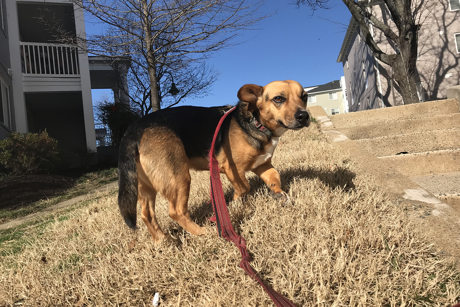 Named for John Elway of the Denver Broncos, Elway is a 4-year-old beagle mix. She enjoys sunning herself, cuddling with her moms, gleefully disrupting yoga class, and walking around and supervising the squirrels of Shirlington. She is often mistaken for a corgi. She is, in fact, not — she’s just low to the ground and very friendly!