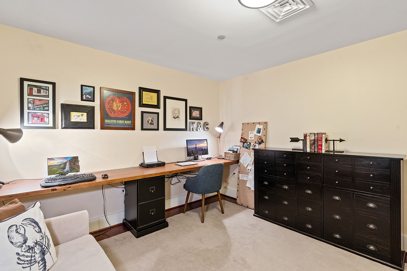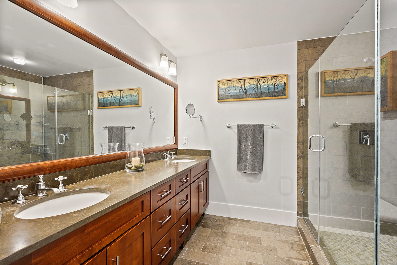 Large windows ventilate the primary bedroom, which offers a sitting or desk area and a walk-in closet organized with drawers, shelves and cabinet storage. A double sink vanity in the bathroom offers more storage, and there is an oversized glass-enclosed shower.