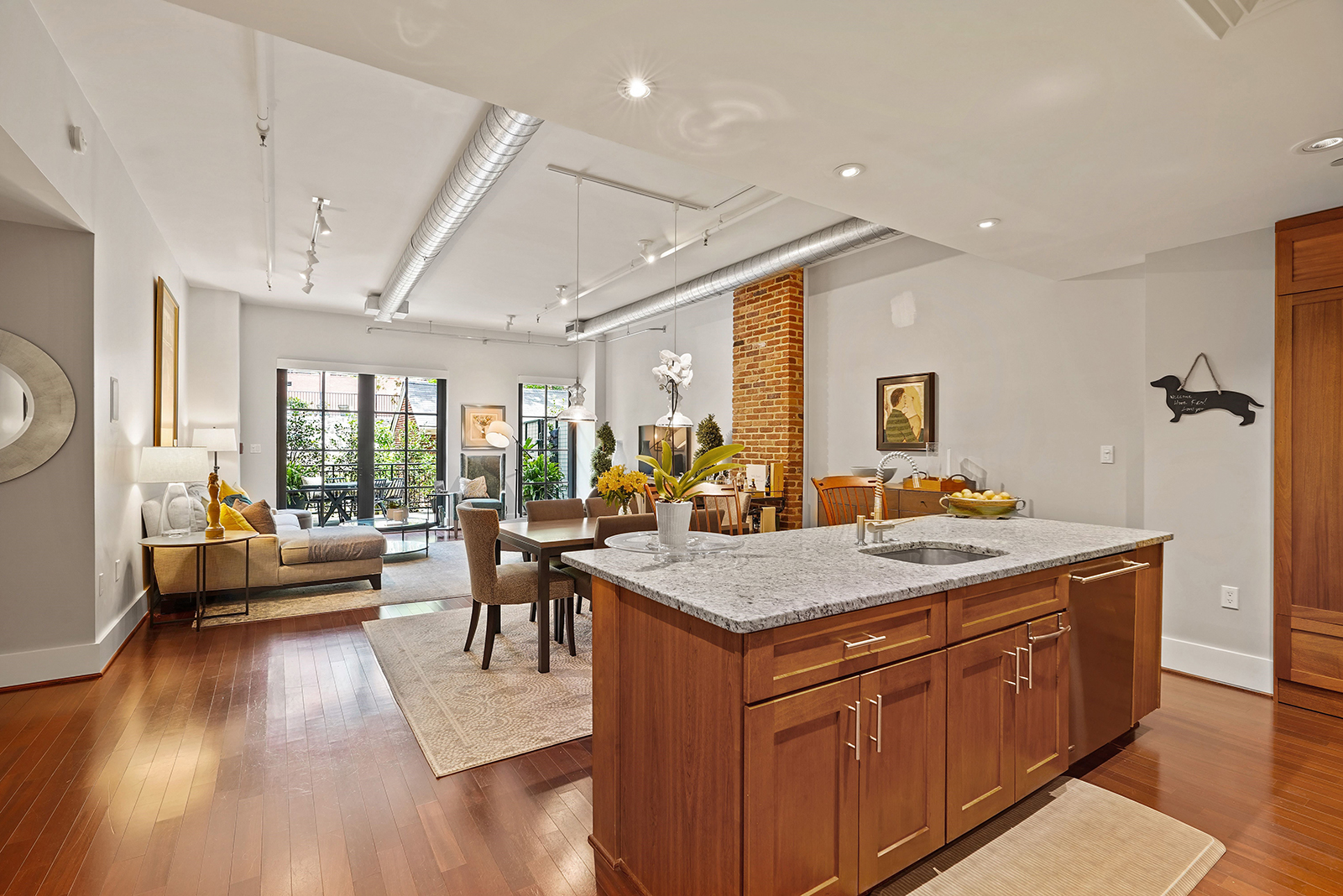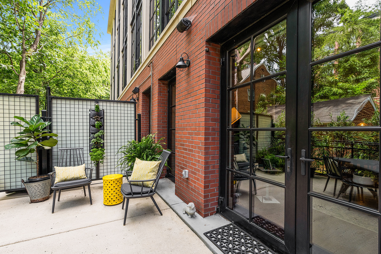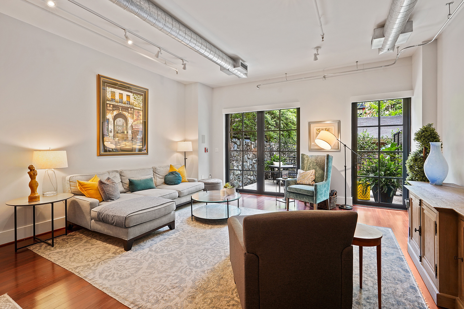 Comfort, style and convenience are embodied in this open, airy Wooster/Mercer loft with an expansive private patio surrounded by greenery. Ten-foot ceilings, tall windows and gleaming wood floors enhance the living space along with an accent wall of bricks reclaimed from Washington’s National Children’s Museum. The area accommodates a dining room, computer spot, seating and a piano. All flow toward the patio, anchored by a handsome stone wall, with room for dining, container gardening and taking a break during an at-home work day. The kitchen features a Sub-Zero refrigerator, Viking gas range, granite countertops and warm wood cabinetry — including a pantry cupboard.