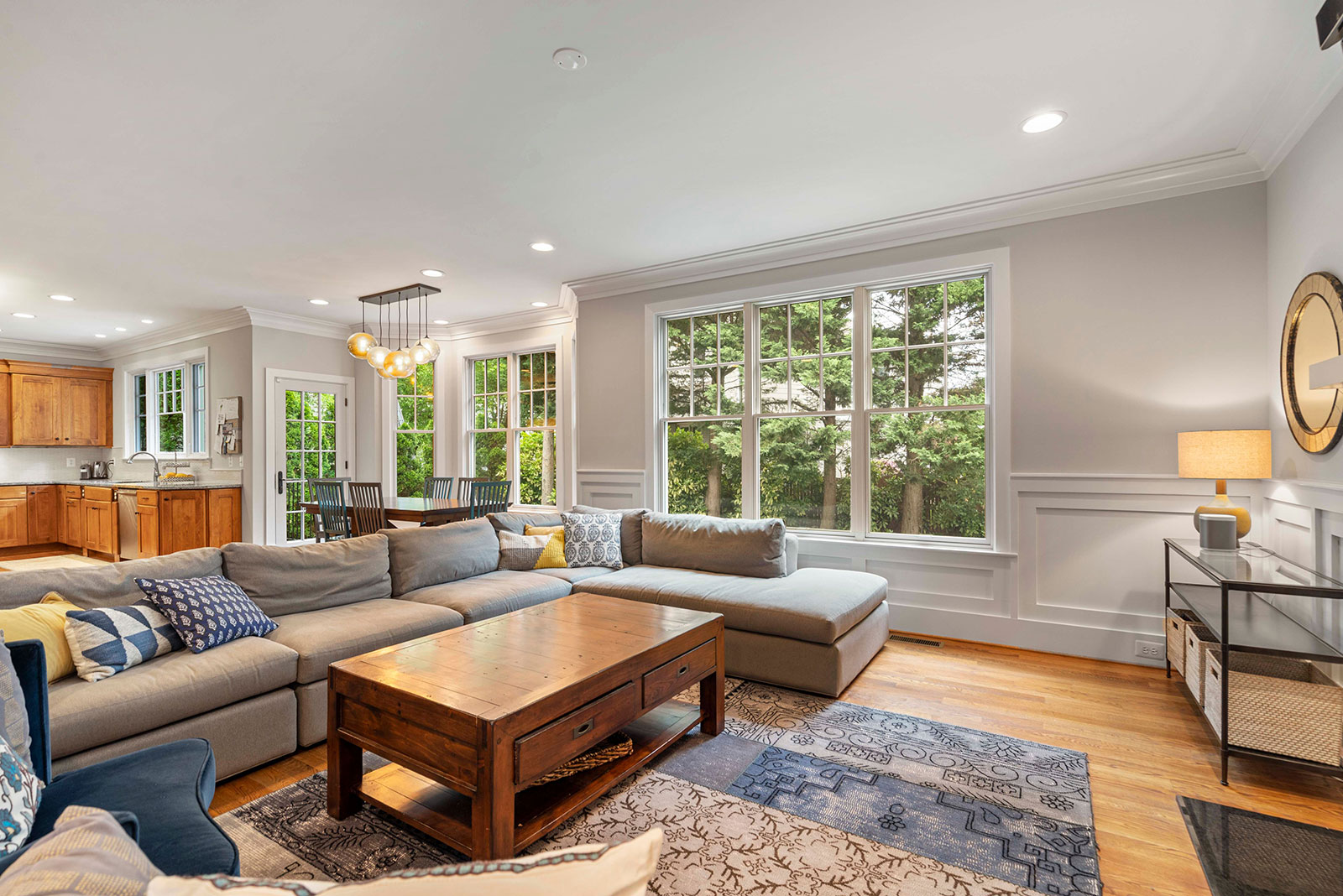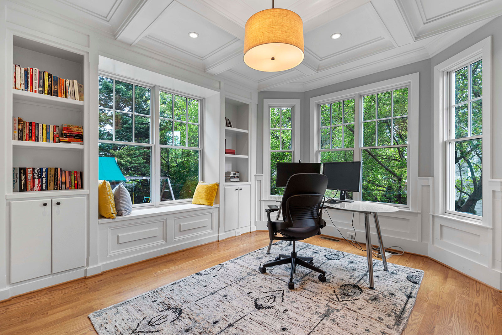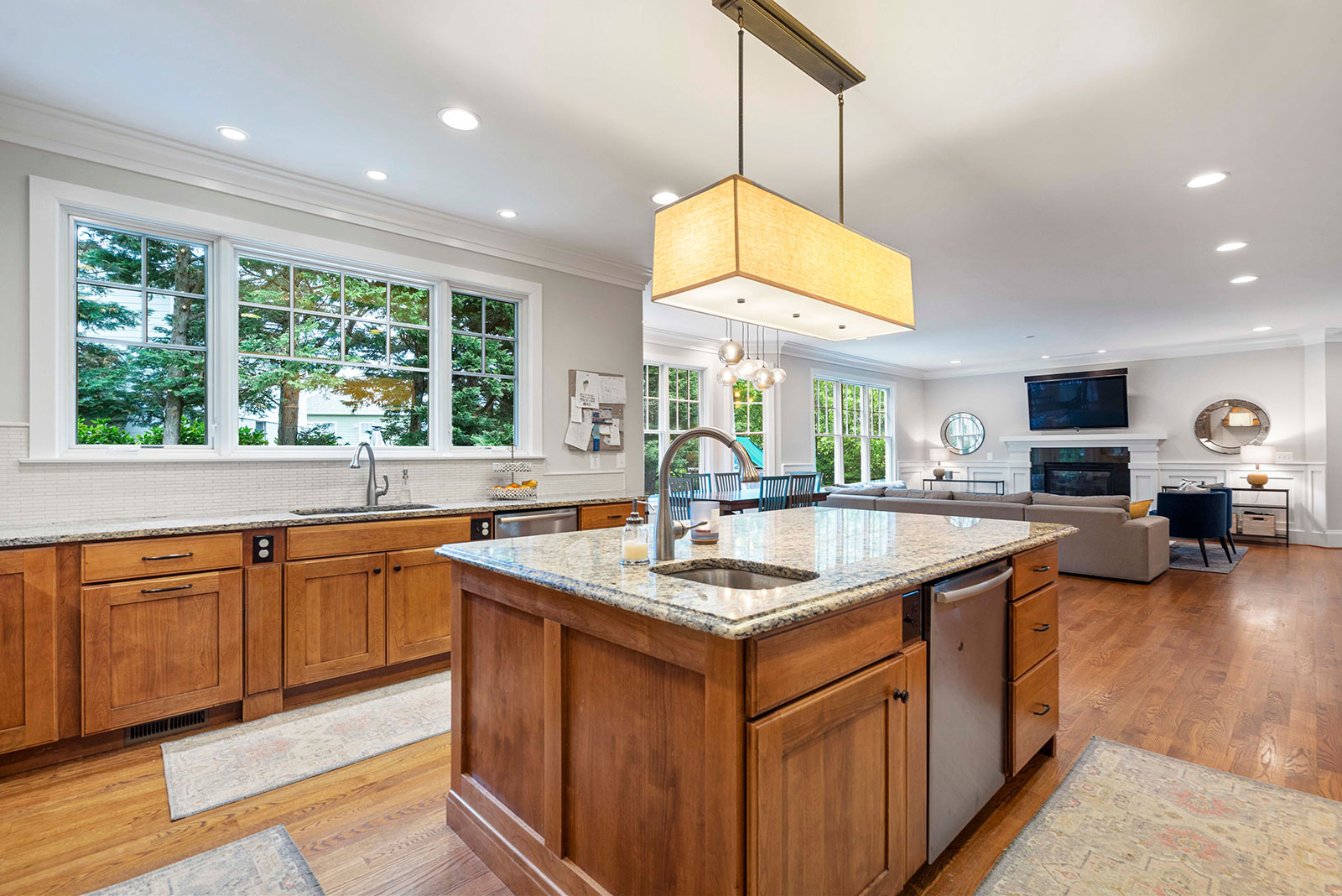 Flexible floorplan with traditional living room, dining room and butler’s pantry, office with coffered ceiling and built-ins, family room anchored by gas fireplace, breakfast area flowing into kitchen with gas cooking, range hood vented to outside, double dishwashers, expansive island, walk in pantry, powder room, and mudroom entry to two car garage.