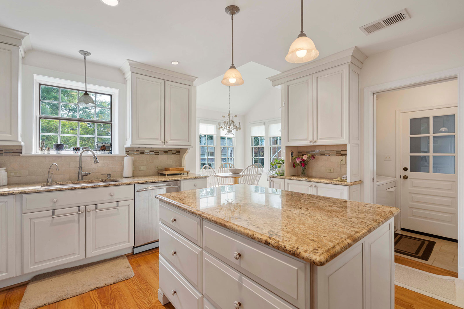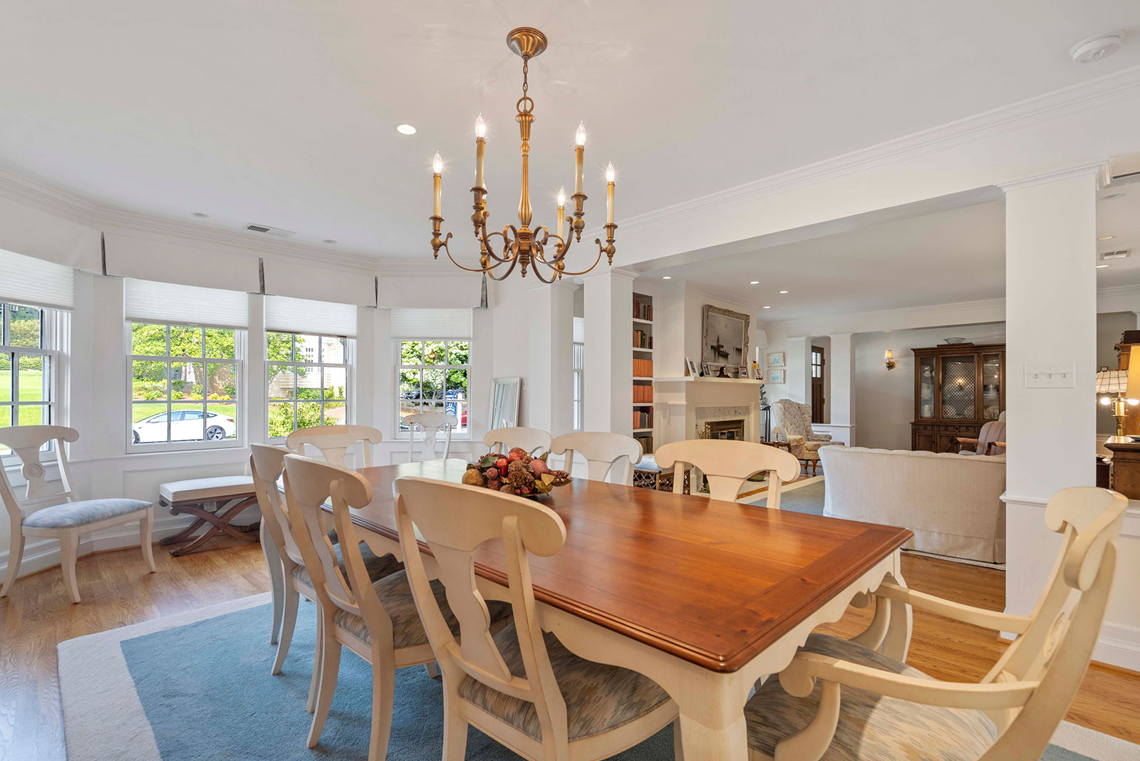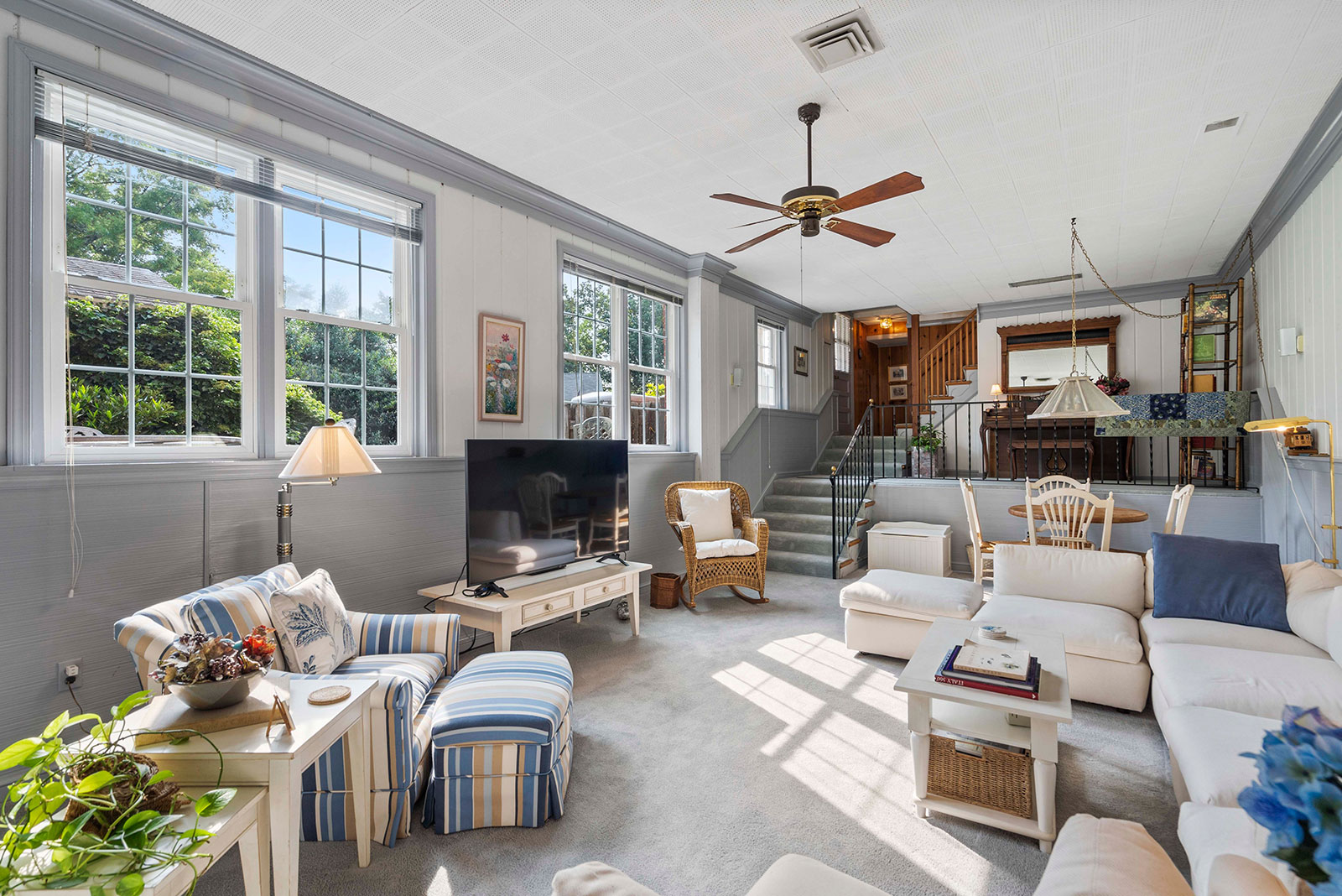 Renovated kitchen with center island flows into sun-filled breakfast room, dining room and living room with fireplace. A laundry area with pantry opens to the carport, making it convenient to bring packages directly into the home. Two bedrooms are on the main level along with both a full and half bath. Upstairs, the primary bedroom has a vaulted ceiling, two walk-in closets, a bathroom with double vanity, soaking tub, and separate shower. Three other bedrooms on this level have architectural detailing, large closets, and are served by a hall bathroom.