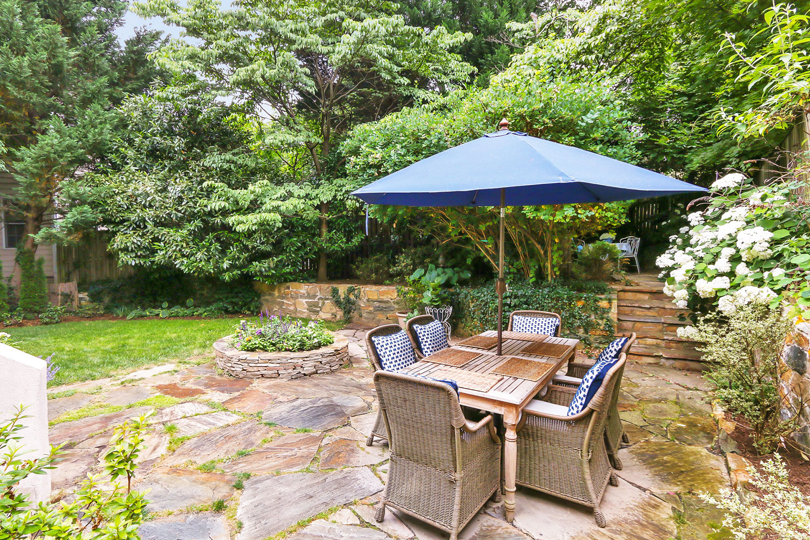 The spectacular backyard oasis with a large patio, mature landscaping, and a “secret” terrace offers a private escape from bustling Arlington.
