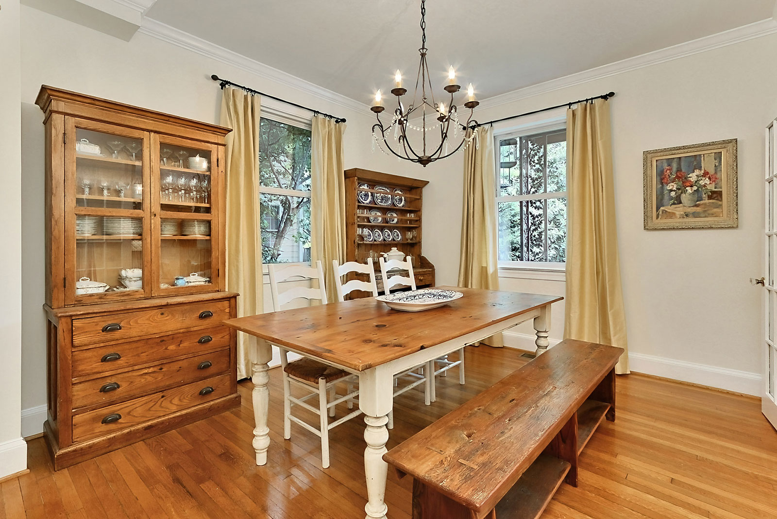 The main level provides an elegant living room with a wood-burning fireplace; a clean-lined, eat-in kitchen with granite counters, breakfast bar, and cherry cabinets; a family room open to the kitchen; a dining room that seats 8; a lovely all-season sunroom; and a rare main-level bedroom.