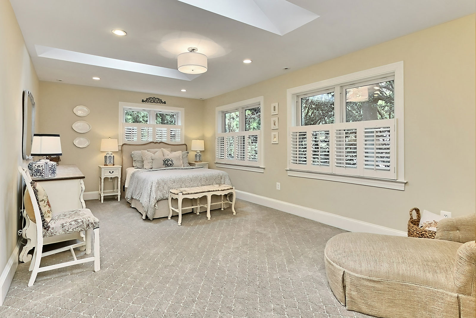The upper level features 3 bedrooms, including the primary bedroom suite with large walk-in closet, an additional bath, and sunny office space with built-in bookshelves. The lower level offers a rec room with a wood-burning fireplace and built-in bar, a huge bedroom suite, and extra space for a gym, office or playroom.