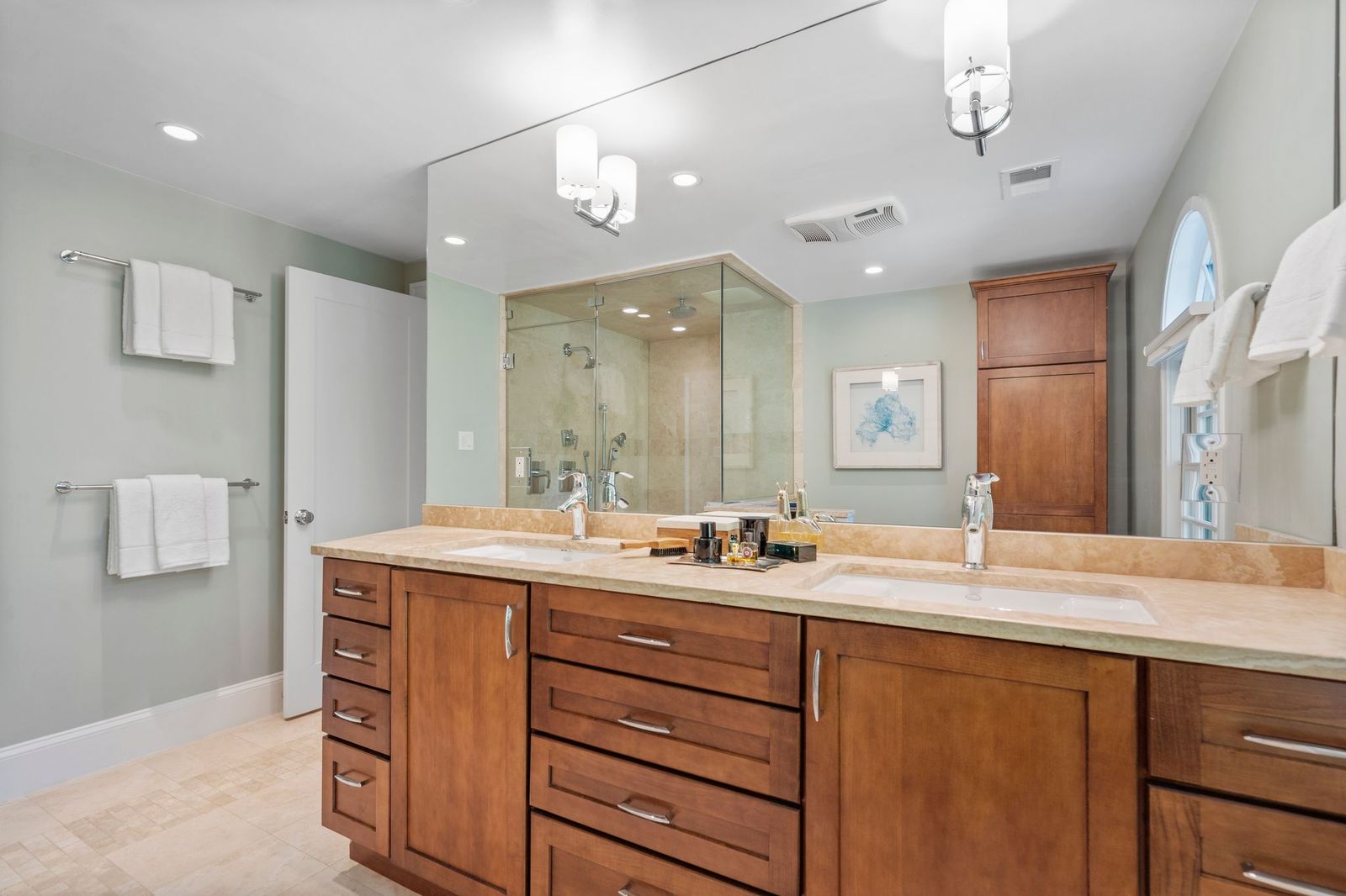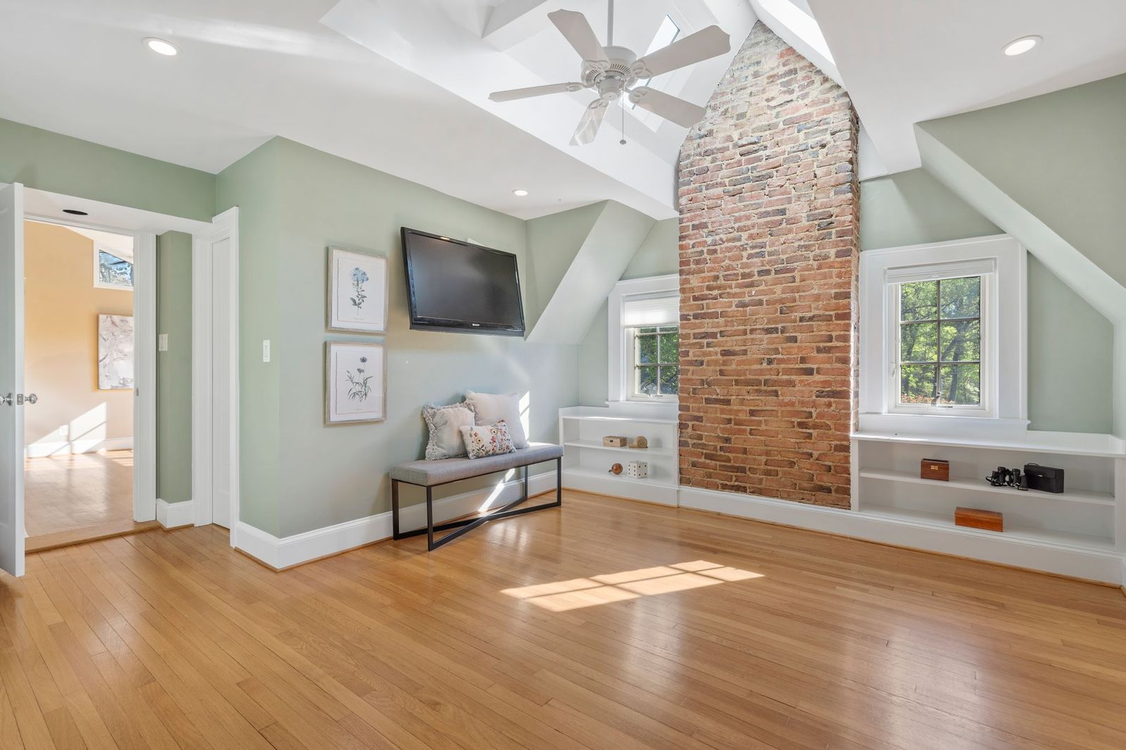 Upstairs, the primary bedroom has a fitted walk-in closet, a separate office with vaulted ceiling and skylights, and a high end bath with oversized shower and double sink vanity.