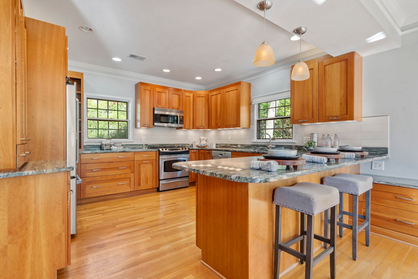 Big kitchen with ample cherry cabinetry, granite tops and breakfast bar, stainless appliances is open to the dining room. Cozy window seat, built ins and multiple windows enhance the room’s appeal. The focus of the living room is the gas fireplace with a window seat tucked beneath an arch. A wall of cabinetry and another window seat in the office make working from home less of a chore. The main level family room can double as guest space with a nearby bathroom with soaking tub and adjoining laundry.
