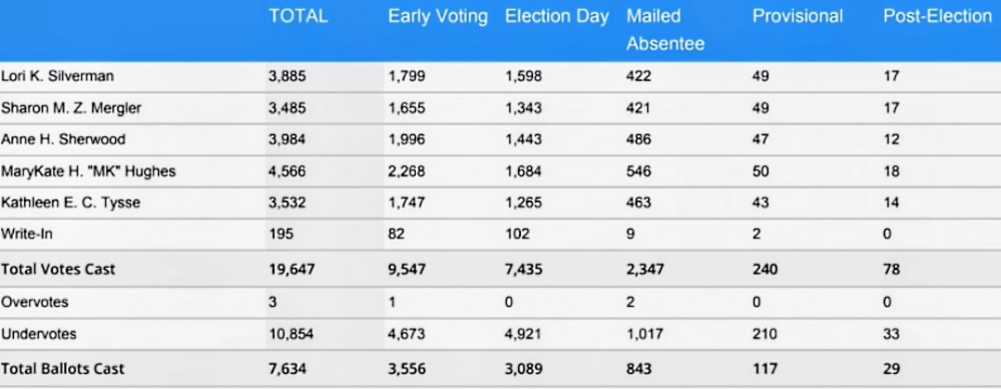 Electoral Board members certified the results Wednesday (Nov. 12). After tabulating provisional ballots and those received by mail by the Nov. 7 deadline, the margin between Kathleen Tysse (3,532) and Sharon Mergler (3,485) tightened from the 56-vote margin reported on Election Night to 47 votes upon certification.