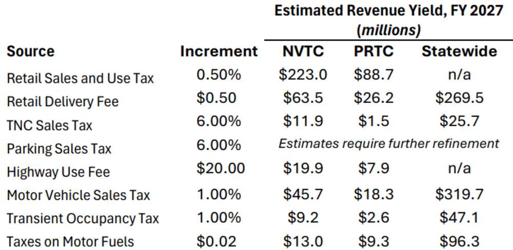 Potential funding streams still on the table for consideration include increases to the sales tax, motor vehicle sales tax, motor fuels tax, highway-use fee and transient-occupancy tax, plus new taxes and fees on retail deliveries, paid parking and rideshare services.