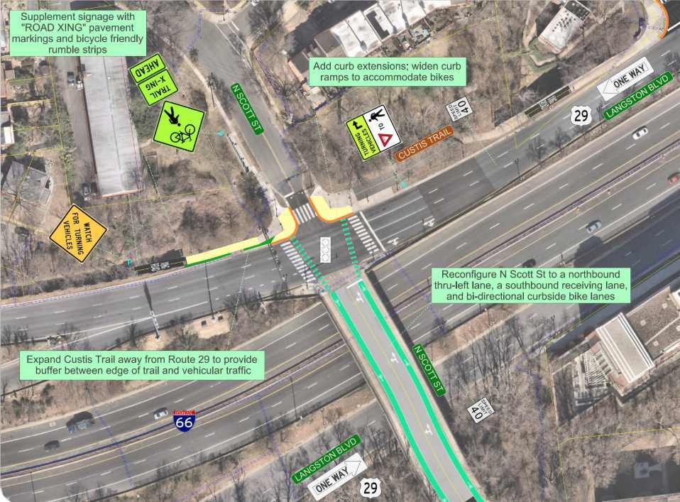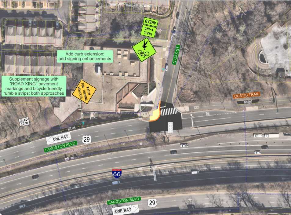 Other possible alterations include a modified traffic signal for the crossing at the Custis Trail, allowing it to be phased separately from westbound vehicles making right turns, and enhanced warning signage to improve awareness of the trail crossing.
