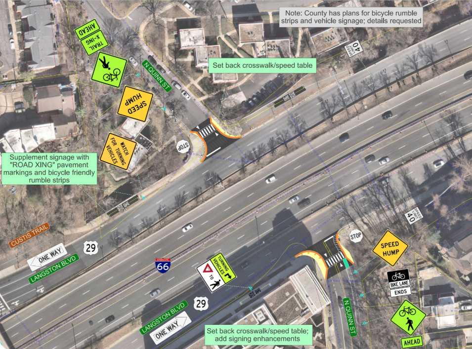 VDOT proposes better pavement markings and “bike-friendly rumble strips,” a realignment to improve sight lines at N. Quinn Street and enhanced signage to improve awareness of the trail crossing at various intersections.