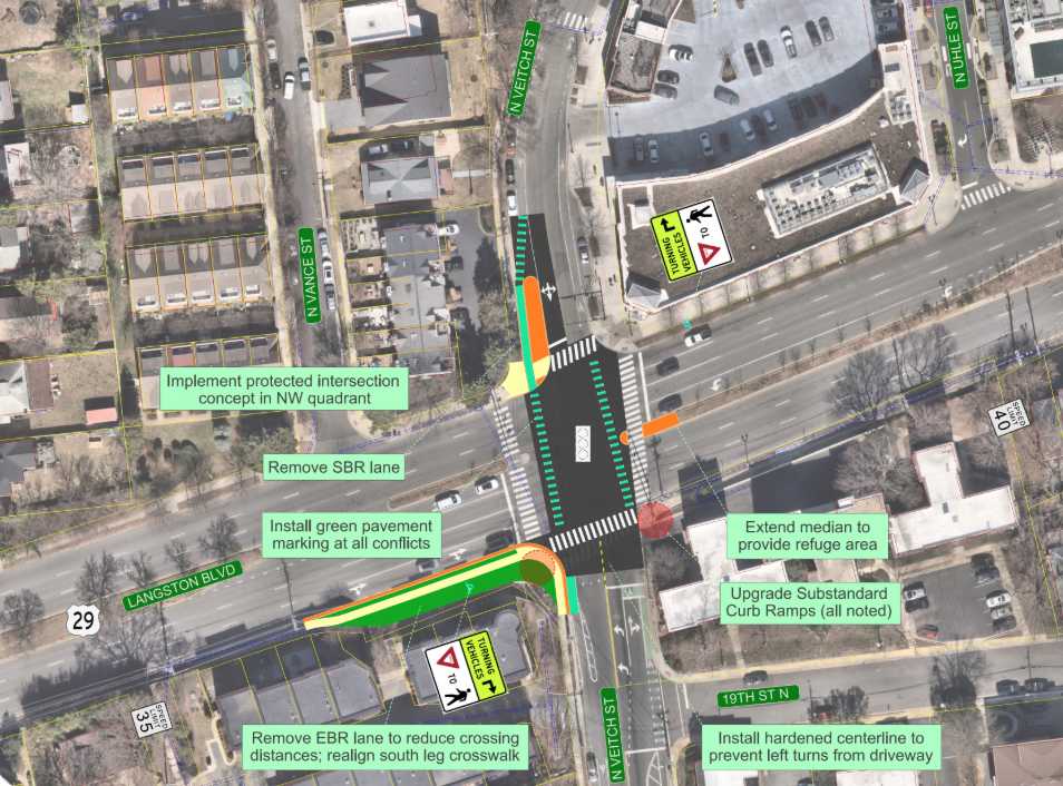 The Virginia Department of Transportation (VDOT) has released a set of six conceptual sketches at Langston Blvd intersections between N. Lynn Street and N. Veitch Street. The agency is seeking more public feedback as part of an attempt to strengthen safety and operations along the busy road and the nearby Custis Trail.