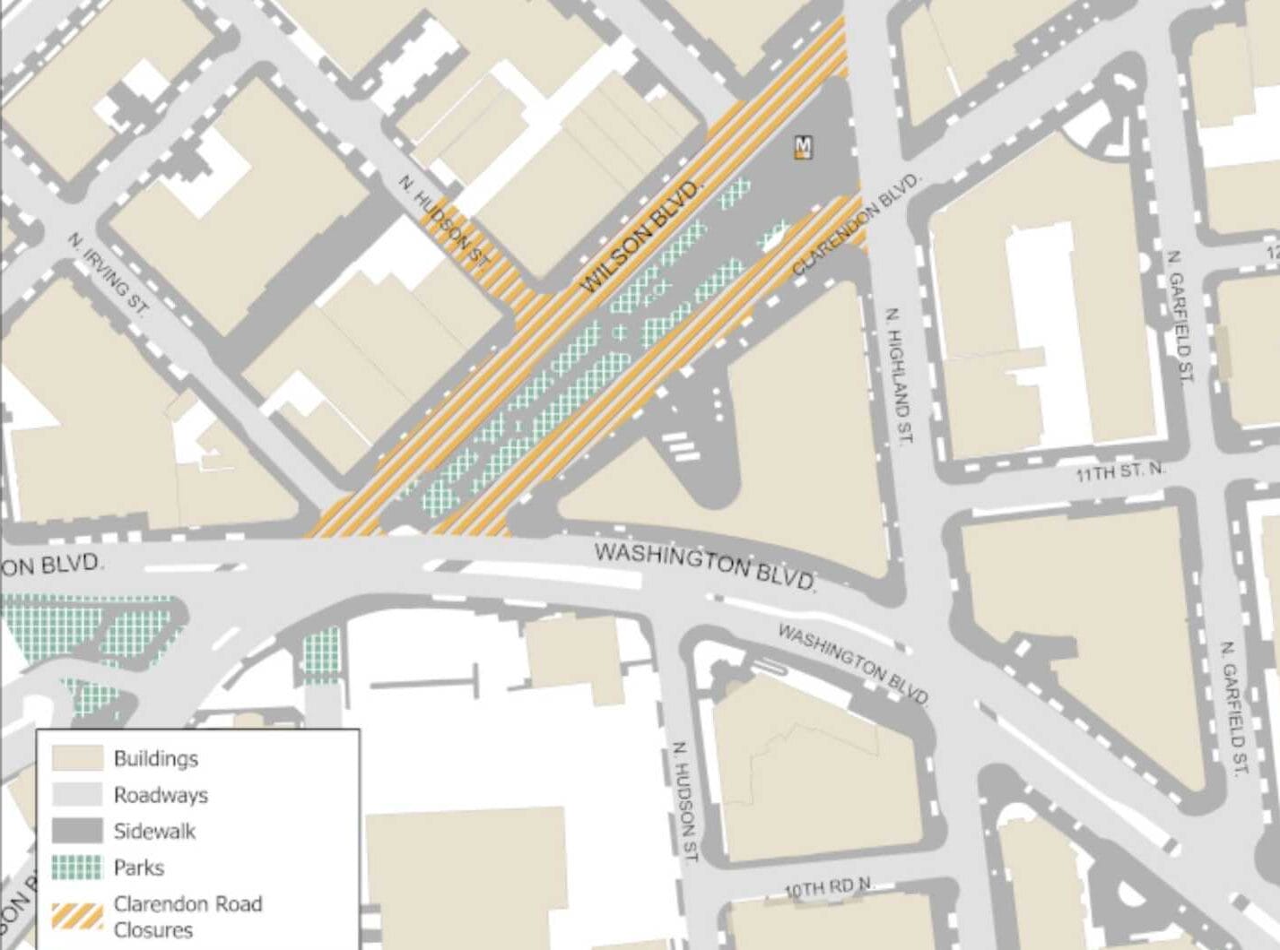 The Arlington County Police Department is closing off Wilson Blvd and Clarendon Blvd between N. Highland Street and Washington Blvd “to accommodate the expected increase in nightlife activity.”