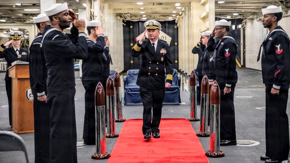 At the ceremony, the commander of Expeditionary Strike Group 2 lauded Scaliatine’s leadership as the warship moved from dry docking back to service life.
